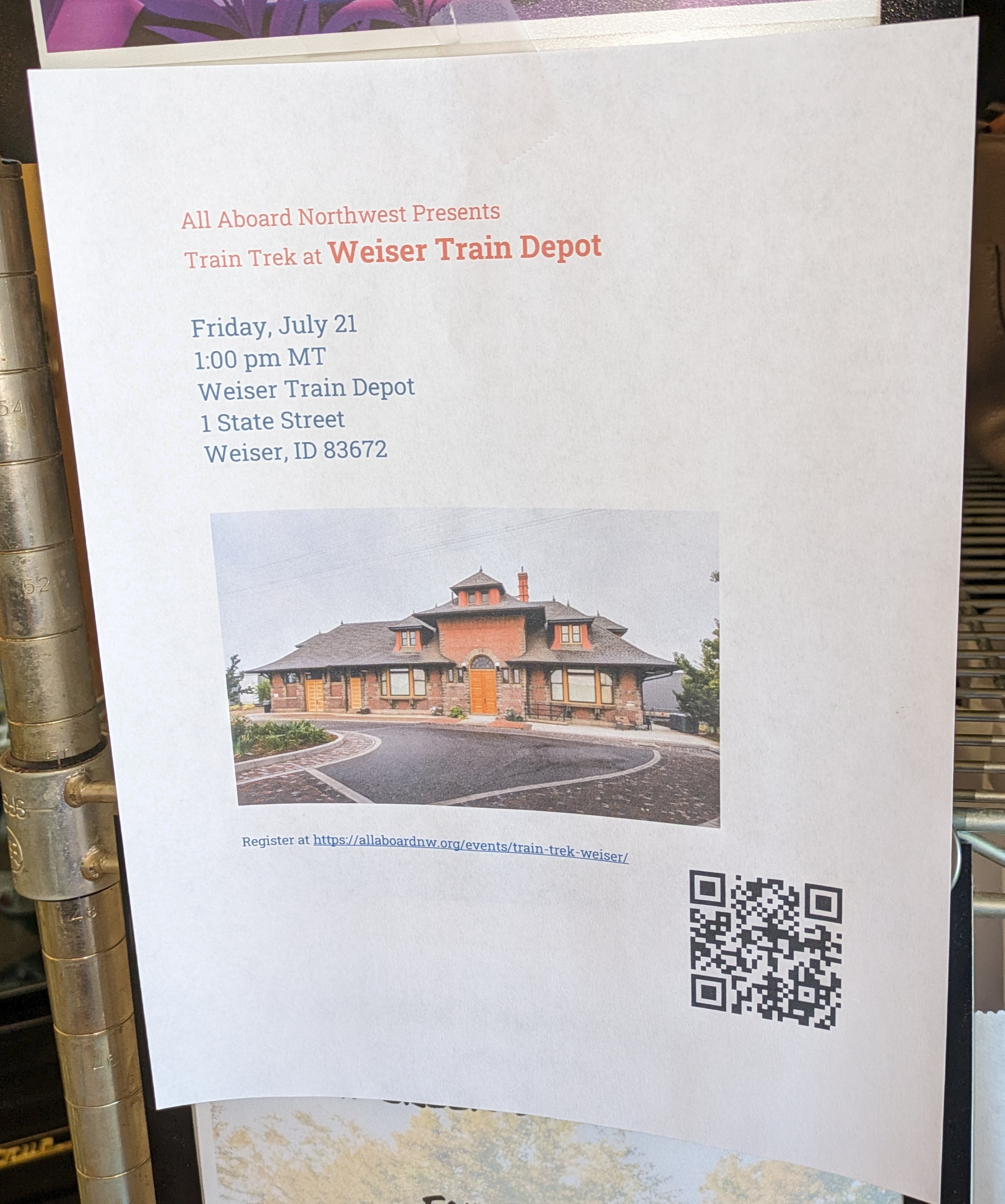 On Friday, the Weiser Train Depot served as the venue for Train Trek, a series of outreach and engagement meetings aimed at gathering support for the resumption of rail service between Colorado and the Pacific Coast. The events are organized by All Aboard Northwest, an advocacy group which is pushing for use of available federal funds to re-establish rail service in the Greater Northwest region of the U.S., from eastern Oregon to South Dakota.